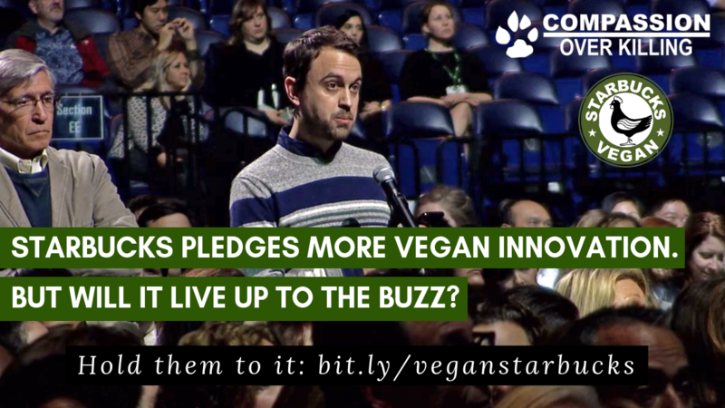 After pledging to brew up a nationwide vegan food line one year ago, Starbucks seems to have stalled out. So Compassion Over Killing roasted the coffee chain’s lack of progress at its annual shareholder meeting today—prompting a commitment to continued vegan innovation. Help us make sure Starbucks follows through on its promise this time around with a quick tweet TODAY!
