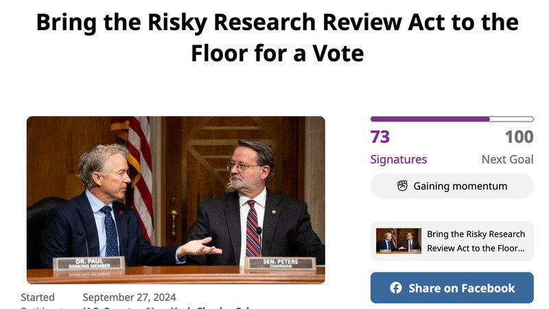 Click here to sign our new petition calling on Senator Chuck Schumer to bring the Risky Research Review Act (S. 4667) to the floor for a vote.