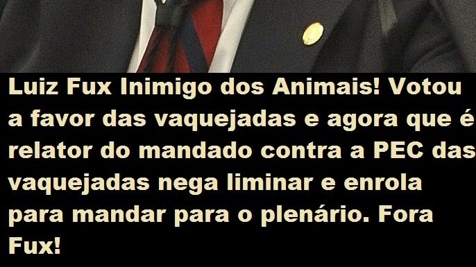 So we demand: get out of the way Fux, stop doing everything to harm innocent and sentient beings, make the report immediately and release the writ of mandamus to be judged by the plenary or declare your impediment because you are not impartial and have connection with vaquejadas and order the redistribution of the process to someone who has some respect for animals, you act as a dictator by holding a writ in your hands so that it will not be judged in the plenary only to defend the interests of sadistic people who amuse themselves with torture of animals, we are tired of you Luiz Fux.
