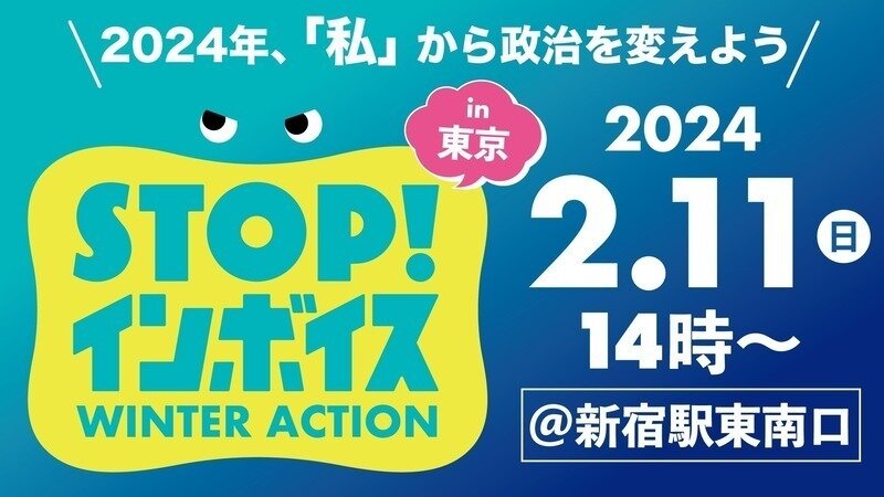 2月11日(日)に開催する「STOP!インボイス WINTER ACTION」東京会場の場所が、JR新宿駅南口 → JR新宿駅東南口広場に変更となりました。https://maps.app.goo.gl/yhB6HXHSVZrtvQqB6