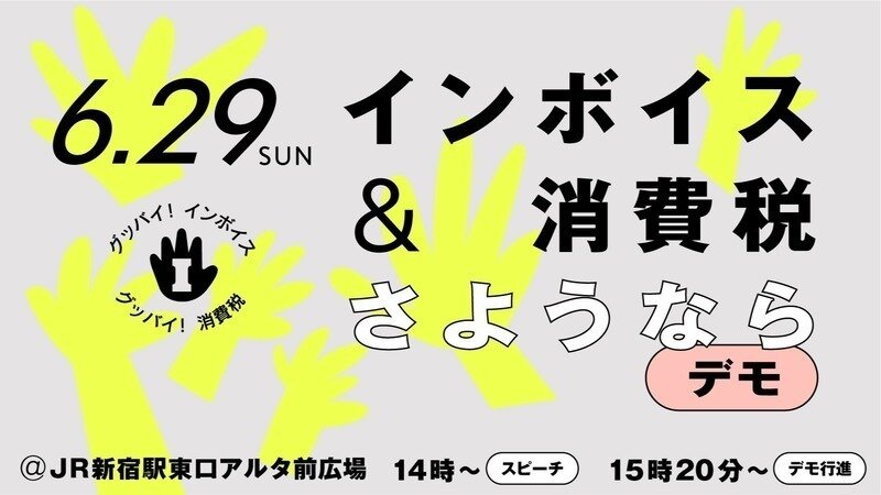 参院選公示日直前の日曜日となる6月29日、新宿東口アルタ前広場で、「インボイス&消費税さようならデモ」を行います。