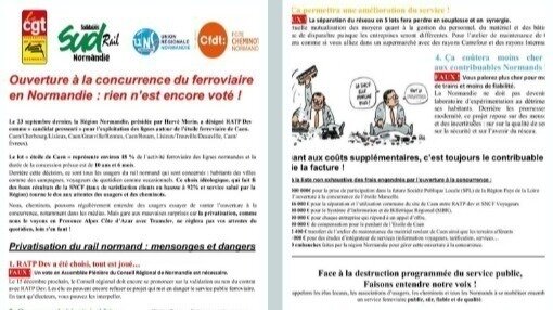 Le tract des syndicats (CGT Cheminots Normandie, SUD Rail Normandie, UNSA Ferroviaire Normandie, CFDT Cheminots Normandie) démonte point par point les contrevérités avancées par la majorité régionale pour justifier cette privatisation :