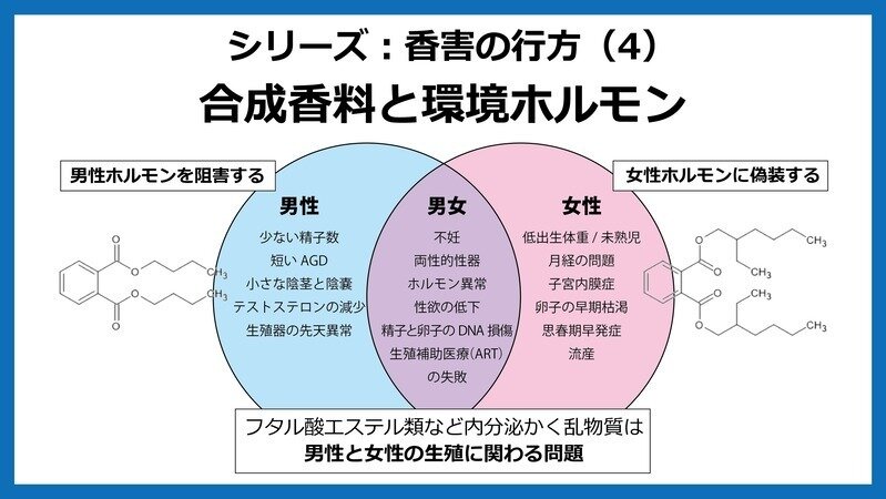 添加剤「フタル酸エステル類」は、プラスチックを柔らかくするための「可塑剤」として使用されており、海のプラごみからも、添加剤が魚に蓄積し、生物濃縮を経て、人にも入ってくることが問題になっています。このフタル酸エステル類は、「合成香料」にも、香りを保つための「保留剤」としてよく使用されている添加剤です。フタル酸エステル類は、「環境ホルモン(内分泌かく乱物質)」として知られています。体の様々な機能を調節するホルモンの情報伝達をかく乱する働きをしてしまい、大量でなくても、ごく微量でも、男女の生殖機能に影響し、次世代や次々世代にまで影響する可能性があります。そのため、子どもの玩具には使用が規制されていますが、日用品や香料への使用は規制されておらず、室内環境中ではハウスダスト(ほこり)に吸着して、繰り返し吸い込んでしまっています。
