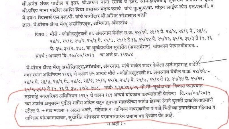 अंबरनाथ नगर परिषद के मुख्य अधिकारी *भालचंद्र गोसावी* और टाउन-प्लानर *विद्यासागर चव्हाण* ने इमारतों की संख्या का उल्लेख किए बिना, *विंग्स* का उल्लेख किए बिना *फर्जी* प्रारंभ प्रमाण पत्र जारी किया।