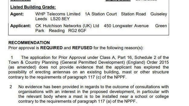 We are sincerely hoping that with two refusals, WHP telecom will get the message that this is NOT the right location for this mast and they need to consider other sites, further away from residences and sensitive locations or upgrade their existing structures. The photo details the grounds for the refusal.