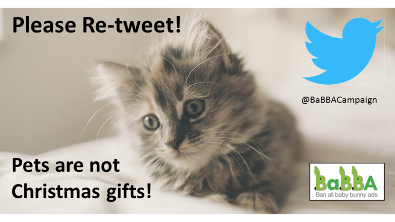 Today I reported a few more ads on Pets4Homes. Baby rabbits advertised as ‘Perfect for Christmas’ Puppies that can be held until Christmas Day, and kittens described as the ‘Best Christmas Gift’