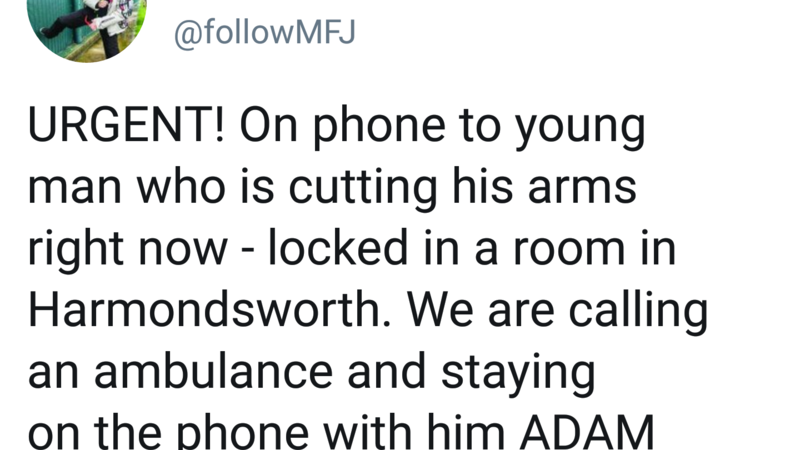 "URGENT! On phone to young man who is cutting his arms right now - locked in a room in Harmondsworth. We are calling an ambulance and staying on the phone with him ADAM HOLLOWAY MP this is your constituent! He need to be taken to hospital NOW! #Jamaica50 #StopCharterflights"