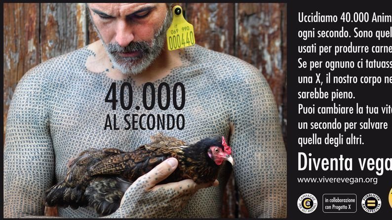 Questa è la comunicazione testuale della nuova pubblicità antispecista dal titolo “40.000 al secondo” che Campagne per gli animali lancia ufficialmente oggi e che verrà presentata il 1 novembre 2017 in occasione del World Vegan Day a Firenze. “40.000 al secondo” è una pubblicità innovativa ideata da Adriano Fragano, Dora Grieco e Roberto Politi e fotografata da Sara Morena Zanella che coniuga messaggio antispecista, contro-informazione sullo sfruttamento animale e artivismo.