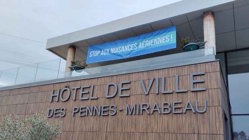 Nous sommes plus de 550 à avoir signé la pétition pour soutenir la Mairie dans une démarche concrète comme le fait Gignac pour lutter contre le bruit des avions. Nous venons d'obtenir une première avancée.....par l'affichage hier par la Mairie des Pennes-Mirabeau d'une banderole sur l'hôtel de ville.