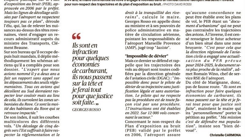 Le Maire du Rove s'est engagé et continue de s'engager contre le non respect du plan d'exposition au bruit par les avions en lancant une pétition et en la portant au préfet. En témoigne l'article de la Provence paru hier.