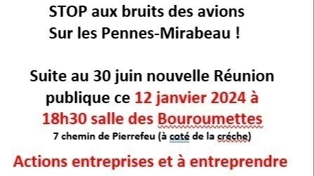 Actualización de la peticiónStop au bruit des avions sur les Pennes-Mirabeau !12 janvier 2024: Réunion publique contre le bruit des avions: quelles actions entreprendre?