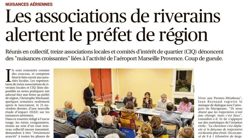BVPM a soutenu la création d'un collectif de 13 associations de riverains de 6 communes voisines de l'aéroport et la signature d'une lettre au préfet suite au lancement de l'étude d'impact en vue d'un arrêté ministériel pour des restrictions d'utilisation de l'aéroport et la définition du nouveau plan de prévention du bruit dans l'environnement. Le journal la Provence a rendu compte de nos actions et vous trouverez ci dessous le lien vers l'Interview de Maritima.