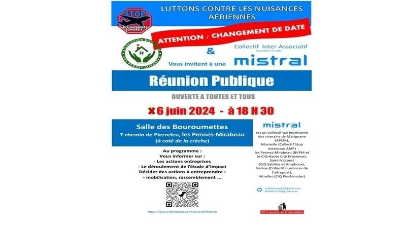 La réunion publique organisée par BVPM et Mistral contre le bruit des avions est donc avancée à cette date, même lieu, même heure.