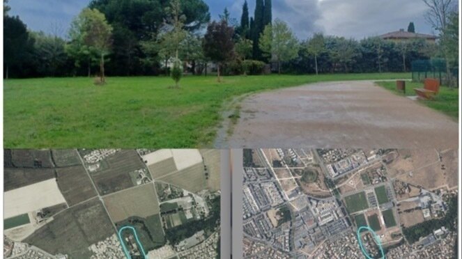 [Collectif Grand Noble/ Andromède] Photos (3) : artificialisation progressive du quartier de 2006 à aujourd’hui (la zone visée par le projet Sporting est entourée en bleu) + la verdure arborée actuelle.