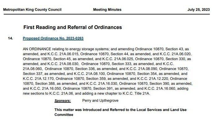 King County Council has proposed amending the law and including a section about BESS- mainly focusing on having a adequate level of insurance for a catastrophic event... They are supposedly having a meeting August 22nd at 9:30am- but, it has NOT been posted yet... And, every other meeting has been Cancelled in August???? (SEE PIC)