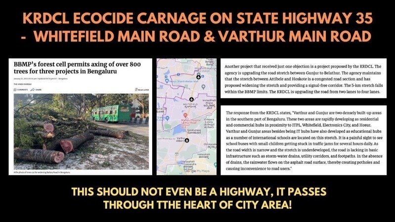 We had highlighted earlier how the KRDCL is executing its RING OF DEATH in and around Bengaluru (Surrounding Roads Proj), widening existing roads, and felling centuries old grandmother trees, which will serve no real purpose, except increasing the traffic in these areas by induced demand, and further deteriorate the conditions of the areas adjoining these roads. This project needs to be frozen or cancelled. It is uncalled for and unscientific.