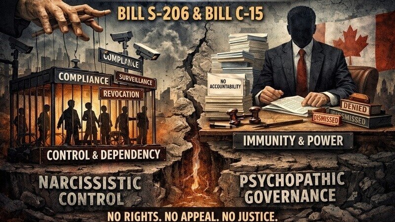 Bill S-206 is presented as compassionate social policy. Bill C-15 is presented as technical governance reform. Examined together, they form a coherent control architecture that mirrors patterns identified in psychology, criminology, and political science as narcissistic and psychopathic governance traits at the institutional level.