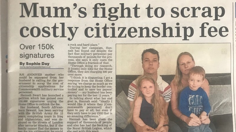 Currently Commonwealth military service personnel have topay £2,300 for the citizenship process, but Hannah wants this to be scrapped and so set up the petition.