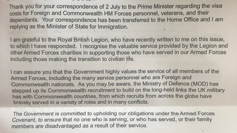 Atualização do abaixo-assinadoStop charging commonwealth soldiers to stay in Britain!Head of immigration letter