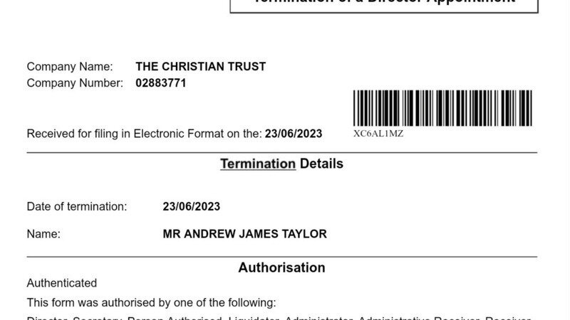 We have discovered that Andy Taylor resigned as a Trustee of The Christian Trust on the 23rd June (see attached). There is no information or announcement as to why, but it is assumed that he is still the International Director.