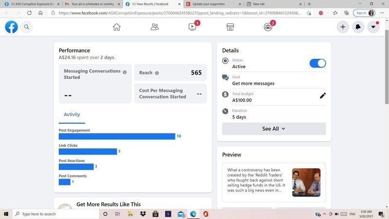 To show myself accountable, here is a picture showing the recent advertising spend of $100 to promote this petition "stop dishonest practices on the ASX and demand a royal commission". The money came from a few donors who contributed to a GoFundMe page that was created for this purpose. Unfortuantely it has not amounted in much success, especially as it was targeted towards young people whoch has been even less successful than targeting the older generation.