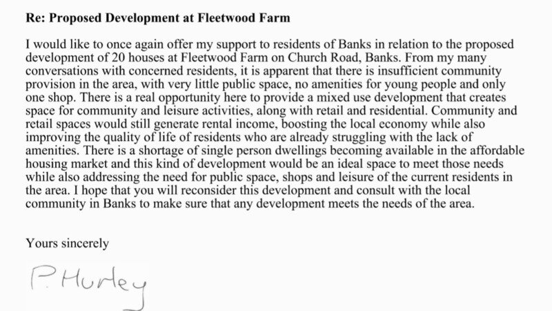 The planning deadline for the proposed housing development at Fleetwood Farm has been extended to 7th February, giving us more time to make our voices heard. This is our last chance to fight for what our community truly needs – a proper village square for Banks, not just another housing estate.