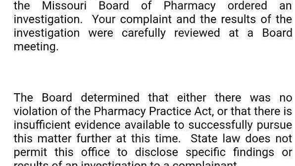 I contacted the State Board of Pharmacy, and they said that the email received Saturday from the State Board of Pharmacy stating that they found "No violation of the Pharmacy Practice Act" was sent in error!