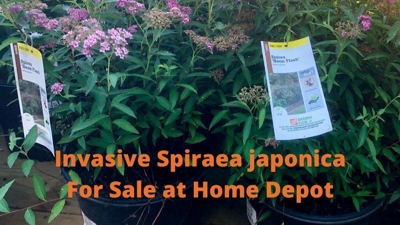 The photo above was taken on June 18 at a Home Depot in northern Virginia. Japanese spirea, botanical name Spiraea japonica, is currently listed as invasive in 8 states — GA, IN, KY, NC, PA, SC, TN, and right here in VA where it's being sold.
