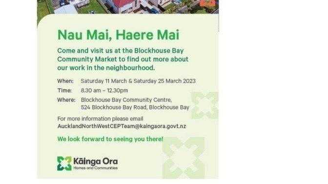 Thank you for your support. We have received a letter today from Blockhouse Bay Intermediate informing us the planned Kainga Ora's community engagement sessions on: