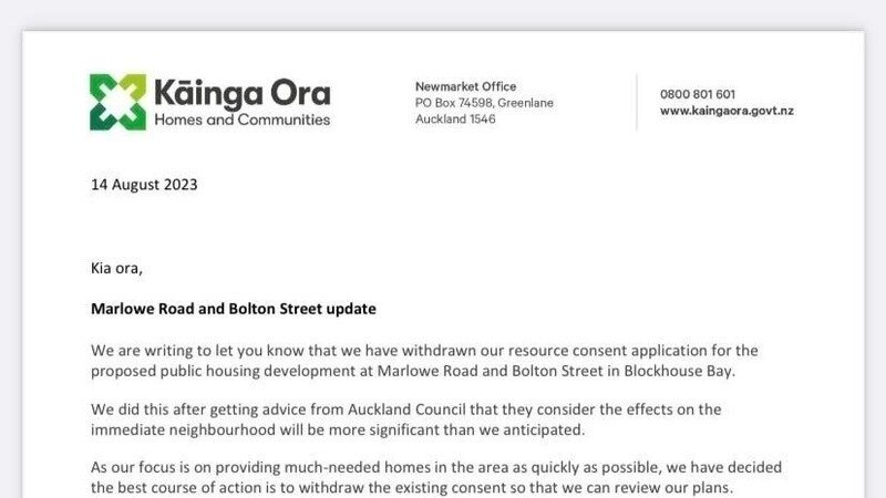 Please see attached a letter from Kainga Ora confirming that the current resource consent application for Marlowe Road and Bolton Street development has been withdrawn from council.