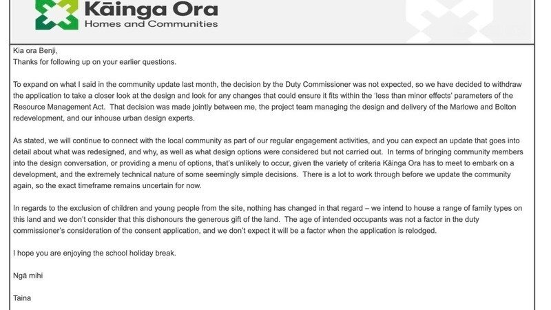 Kia ora whānau, please find attached email correspondence update between Benji on behalf of the community and Kāinga Ora's Regional Director - Taina Jones.