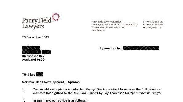 I have emphasised in passing this on to Kāinga Ora and Council that we as a community demand Kāinga Ora pause any lodgment of a resource consent until this matter is resolved. We wish Kāinga Ora to engage with both Auckland Council and the Blockhouse Bay community as to what the plans are to honour the gifting of the land for pensioner housing and how the establishment of trust obligations will be handled.