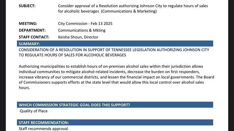 The City of Johnson City has introduced a resolution that would potentially reduce the permitted hours of sale of alcoholic beverages.