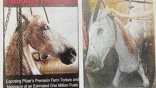 An undercover investigator photographed this exhausted and depleted mare right after her legs collapsed, hanging herself. Sadly, through death, she finally escaped the ongoing hell. She was one of many that could not withstand Pfizer's torturous production process. So I beg you to share the petition with as many people as you can.