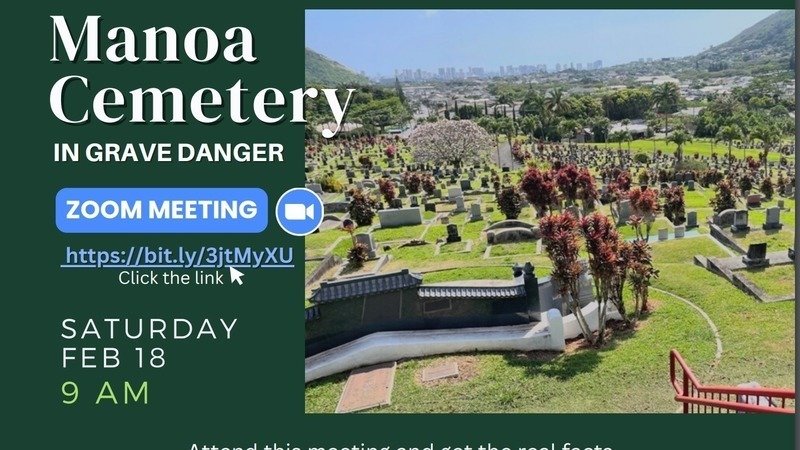 Former Lin Yee Chung Association (LYCA) Trustee Lance Luke invites the community to an online zoom meeting on Manoa Chinese Cemetery, Manoa Banyan Court, 201H, and other concerns on Saturday (18 Feb) @ 9am. See flyer for details.