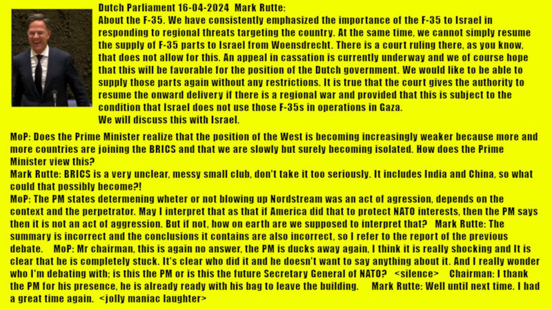 Shocking statements again from Mark Rutte in the Dutch Parliament. He confirms again he wants to send weaponry to Israel despite the judicial ruling forbidding it.