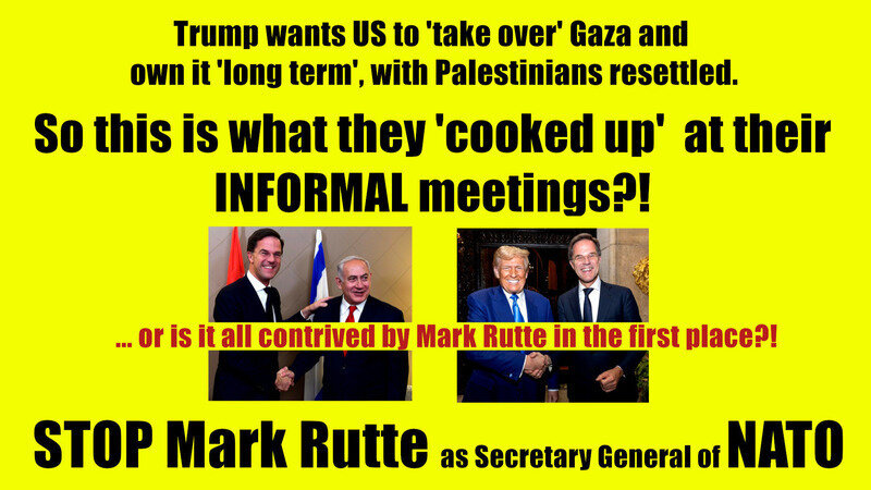 One of the biggest supporters of Netanyahu's horrific Genocide in Gaza is NATO S.G. Mark Rutte. As Prime Minister he gave 100% military support, 100% political support and 100% spiritual support. Even when the highest judges in the Netherlands forbade him to supply weapons, he did everything he could to ignore the judge and continue to help his friend Netanyahu to slaughter children.