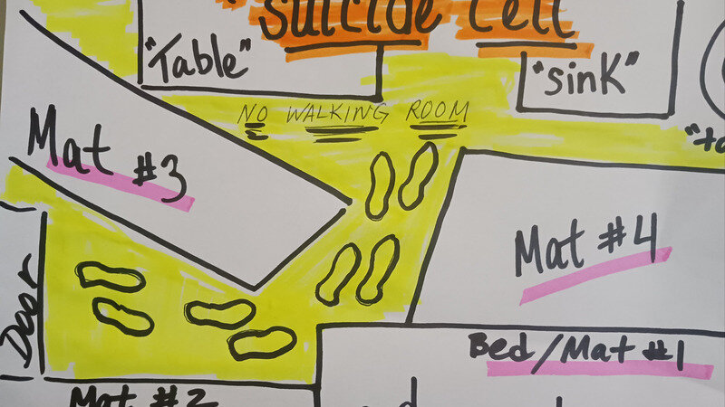 One other issue that another person informed me about is the fact that the "Suicide Cells" are OVERCROWDED. An inmate drew a picture for me of how CROWDED the Suicide Cell can be. This person said that in the "1 bed Cell" they throw in 3 extra cots. This causes one of the beds to be placed close to the toilet that they all share. So, if someone has to use the restroom at night one of the other people has to wake up and move their bed away from the toilet. Can you imagine that!? This is not only inhumane, but is also a health hazard!