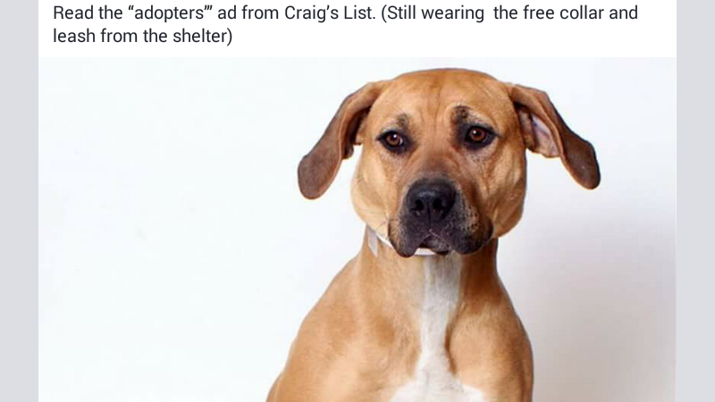 Read the “adopters’” ad from Craig’s List. (Still wearing the free collar and leash from the shelter)