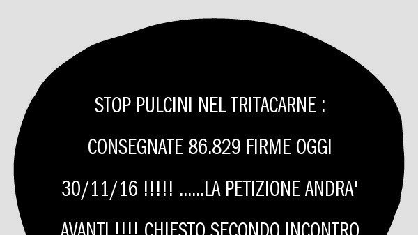 Petition updateSTOP PULCINI NEL TRITACARNE ! Fermiamo il tritacarne con una firma.86.829 FIRME !!! Consegnate oggi 30/11/16. La raccolta firme CONTINUA, prossimo incontro 30/11/17