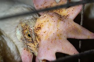 Per favore guarda quel formicolio di acari rossi infestanti sin dentro agli occhi delle povere galline chiuse a migliaia nelle gabbiette x rubare loro le uova (gliene fanno fare anche di più e più grosse del normale).