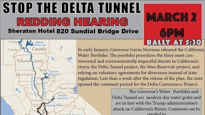 What: The rally will take place before the Department of Water Resources’ North State Public Scoping Meeting for the Delta Conveyance Plan, a proposal to construct a tunnel capable of pumping 6,000 cubic feet per second of water from the Bay-Delta to Southern California Ag and metropolitan users. Indigenous people from throughout the North State will be testifying about how this project is water grab of North State resources that would further decimate salmon and violate tribal sovereignty. This hearing is only happening because Tribes and Youth demanded a North State hearing.