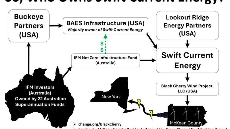 We’re diving deep into research to uncover the truth about this project, and we’re sharing our findings on our Facebook group, which can be found at https://www.facebook.com/share/g/16PNZrZG6P/ - for example, we’ve been investigating the question: "So, Who Really Owns Swift Current Energy?" It turns out, Swift Current Energy, the developer behind the Black Cherry Wind Project, is majority-owned by BAES Infrastructure, a subsidiary of Buckeye Partners, which is fully owned by IFM Investors—an Australian company. Minority stakes are held by IFM Net Zero Infrastructure Fund and Lookout Ridge Energy Partners (the management team). This complex structure raises questions about who’s really calling the shots and how our local interests are being prioritized. In summary, the majority ownership is foreign entities, and through their structures - they are able to maximize their federal deductions and incentives at the expense of the American Taxpayer.