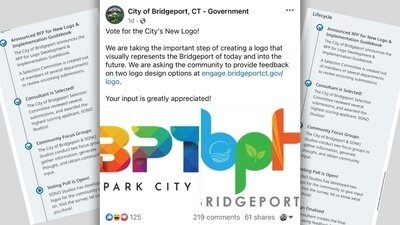 Actualmente, el Departamento de Comunicaciones de la Ciudad de Bridgeport está avanzando en un proceso para rediseñar nuestro logotipo de la ciudad con un precio de $ 28.000 - financiado por nuestros impuestos Bridgeport. El proveedor elegido tiene su sede en Norwalk (SONO Studios).