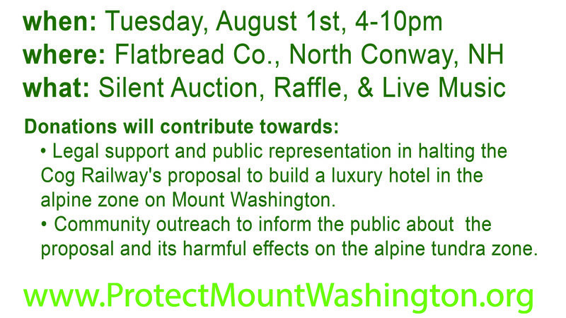 Protect Mount Washington will be having a fundraiser at Flatbread Co., North Conway, NH on Tuesday, August 1st, 4-10pm. Please consider attending to support the cause or please consider donating if you cannot attend at https://www.protectmountwashington.org/