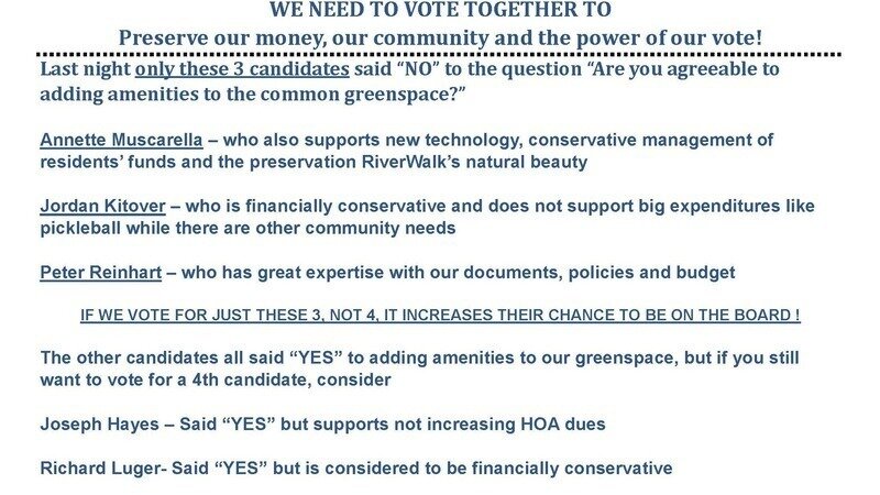 Mise à jour sur la pétitionStop the Construction of Pickleball Courts on RiverWalk's Green SpaceCandidates Night and An Endorsement
