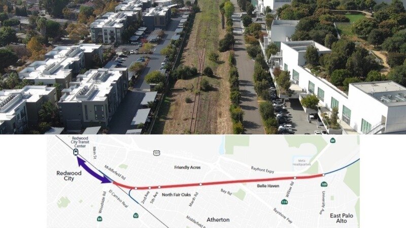For decades, the Dumbarton freight line connecting east Menlo Park with downtown Redwood City has gone unused. SamTrans, which owns that land, is proposing to use it for a zero-emission bus line, along with a bicycle and pedestrian path. The line would go from University Ave., past Meta, through Belle Haven, along Marsh Manor and Bohannon Office Park (a potential housing site), through Fair Oaks, all the way to downtown Redwood City.