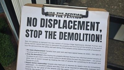 Sign this petition to demand the new owners of Campus Edge Apartments, Michael Putman and Randy Herron, cancel their plans to demolish the property and force out all the tenants at the end of July! We demand that the safety and well-being of the tenants comes before the profit of landlords!