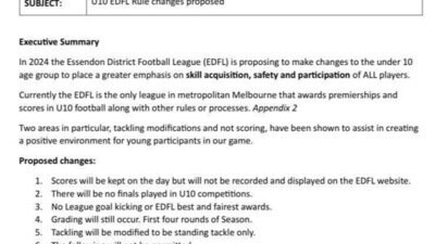 The EDFL have submitted a proposal to remove scoring, ladders, playing finals and individual awards from the under 10s age group with the intent to increase participation.