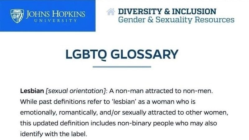 Lesbians and women at Johns Hopkins University are being defined in official documents as “non-men.”